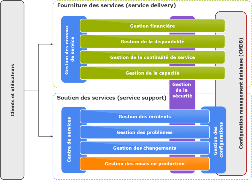 La gestion des mises en production se situe au même niveau que celles des incidents, problèmes et changements, du côté du soutien des services de la cartographie ITIL ®.