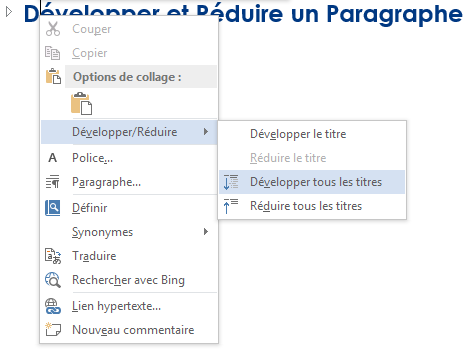 Il est en outre possible de développer ou de réduire tous les titres/paragraphes d'un document d'un coup, via un clic droit de souris sur l'un des titres du document (peu importe lequel).