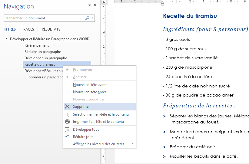 Cliquez y ensuite (clic droit) sur le paragraphe à supprimer, dans ce cas celui nommé "Recette du tiramisu". L'option "Supprimer" est alors à votre disposition, et le tour est joué!